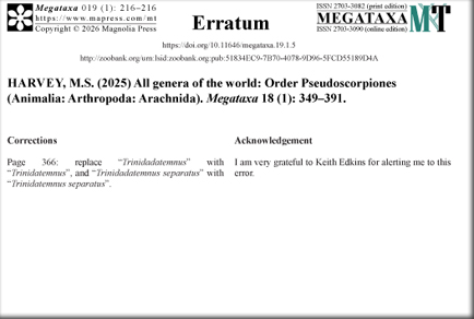 Harvey, M.S. (2025) All genera of the world: Order Pseudoscorpiones (Animalia: Arthropoda: Arachnida). Megataxa 18 (1): 349–391.