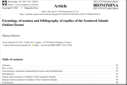 - Frétey, T. (2023) Etymology of nomina of amphibians and reptiles of the French Antilles. Bionomina, 35: 20–50. <https://doi.org/10.11646/bionomina.35.1.3>.