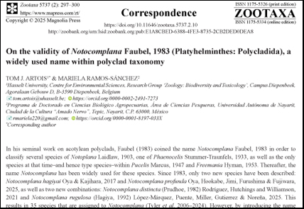- López-Márquez, V., Puente, A., Miller, J.P., Gutierrez, A. & Noreña, C. (2025) Exploring the Intricate Web of Biodiversity: Notocomplana (Rhabditophora: Polycladida: Notocomplanidae) Species Networks in the North Pacific Ocean. Zoological Science, 42 (3), 287–298. https://doi.org/10.2108/zs240053