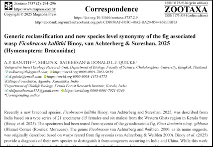 - Binoy, C., Achterberg, C.V. & Sureshan, P. (2025) A new species of the non-pollinating fig wasp genus Ficobracon van Achterberg & Weiblen (Hymenoptera: Braconidae) associated with Ficus tinctoria subsp. gibbosa (Rosales: Moraceae) from the Western Ghats, India. Zootaxa, 5691 (1), 130–136. https://doi.org/10.11646/zootaxa.5691.1.7