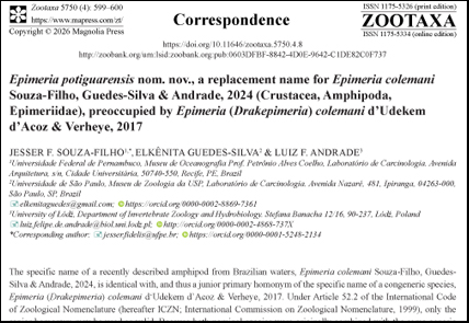 - Souza-Filho, J.F., Guedes-Silva, E. & Andrade, L.F. (2024) Four new species and two new records of deep-sea Amphipoda (Crustacea: Peracarida) from Potiguar Basin, north-eastern Brazil. Journal of Natural History, 58 (41–44), 1615–1655.