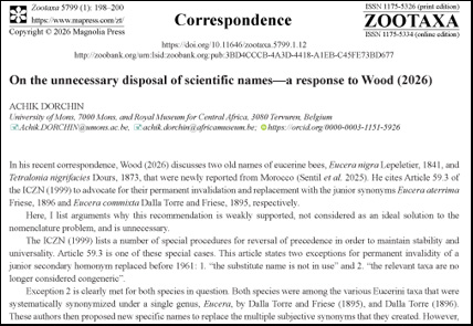 - Wood, T.J. (2026) On the permanent invalidity of certain eucerine bee names (Hymenoptera: Apidae: Eucerini). Zootaxa, 5748 (1), 144–146. https://doi.org/10.11646/zootaxa.5748.1.10
