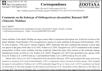 Comments on the holotype of Orthragoriscus alexandrini, Ranzani 1839 (Teleostei: Molidae)