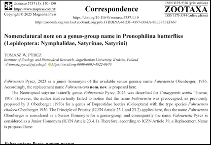 Nomenclatural note on a genus-group name in Pronophilina butterflies (Lepidoptera: Nymphalidae, Satyrinae, Satyrini)